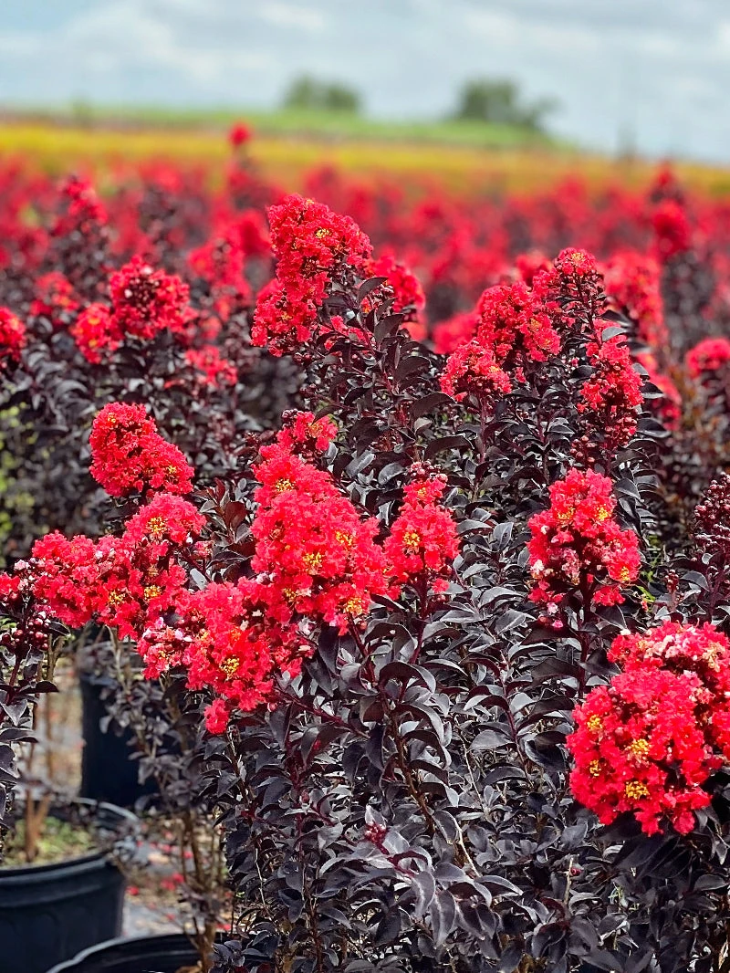 Talk about a sizzling combination! This compact beauty has large red inflorescences that cover the plant when they flower. Sunset Magic™ flowers more heavily than other reds with dark foliage. Deep black-purple leaves are flat, lustrous and hold their dark color into late summer. Foliage has been disease-free to date. Cold hardy in USDA Zones 7-9.