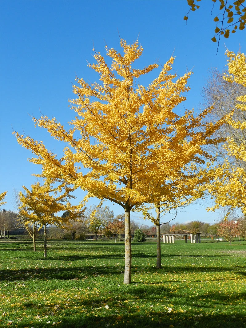 The ginkgo tree is thought to be one of the oldest living trees, dating back to more than 150 million years. Ginkgo is a deciduous, hardy shade tree with unique fan-shaped leaves. It is native to China, Japan, and Korea, but is also now grown in Europe and the United States. Ginkgo biloba, or maidenhair, is practically pest-free, resistant to gypsy moth, long living, and drought tolerant. Young trees are often very open but they fill in to form a denser canopy. It makes a durable street tree as it is tolerant to air pollution and road salt. It also makes for an excellent specimen tree, including bonsai. The shape is often irregular with a large branch or two seemingly forming its own tree on the trunk. Ginkgo tolerates most soil, including compacted, and alkaline, and grows slowly to 75 feet tall or more. The tree is easily transplanted and has a vivid yellow fall color which is second to none in brilliance, even in the south. However, leaves fall quickly and the fall color show is short. Cold hardy in USDA Zones 4-9.
