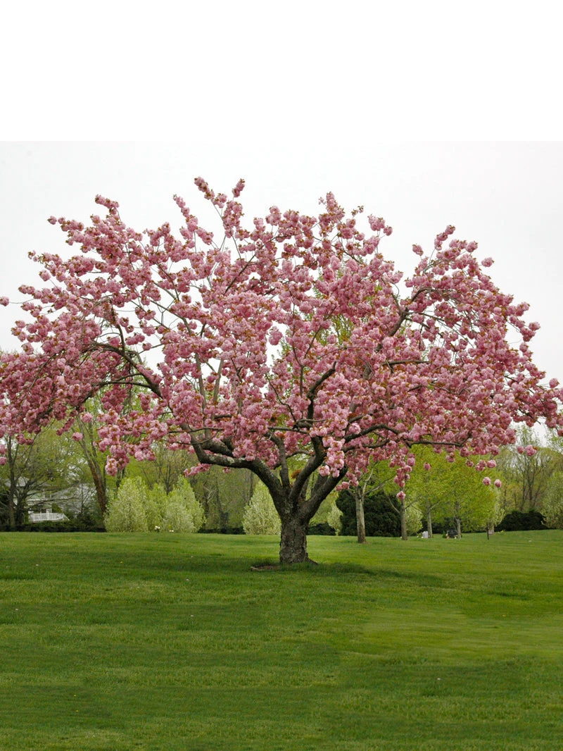 The Kwanzan Cherry is a deciduous, flowering tree which yields a mass of fragrant, double pink blossoms in an upright, vase-shaped form (i.e. at maturity, the tree’s spread is wider than the tree is tall). In the fall the foliage turns shades of yellow and orange, providing wonderful autumn colors for your yard or garden. The tree has a medium growth rate and is hardy to -05 degrees (Zones 5-9). The height and spread reach about 30-40 feet. Plant this tree in full sun with moist, well-drained soil.