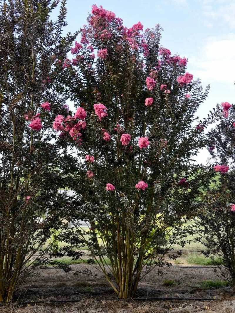 Twilight Magic showcases a stunning combination of deep plum-colored foliage and coral-pink flowers from mid-summer through early fall. This upright, multi-stem tree really stands out in the landscape when it blooms. It reaches a maturity height of 16 feet with a width of 8 feet. Even when not in flower, the dark foliage is handsome all on its own. An excellent alternative to purple leaf plums in areas where plums are defoliated by August. Resistant to Cercospora leaf spot and powdery mildew.