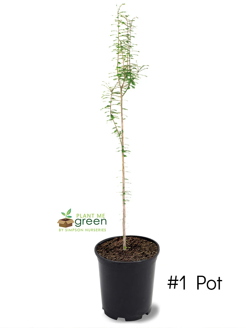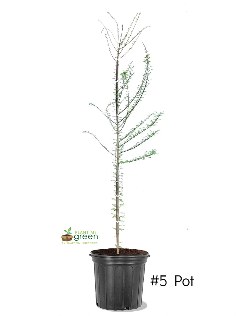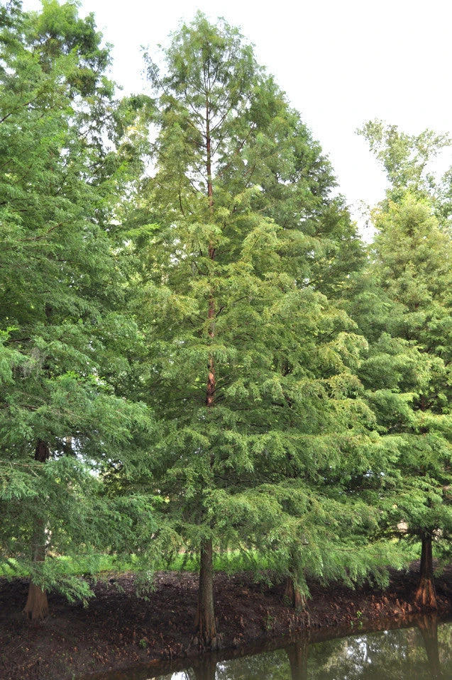 The Bald Cypress is a beautiful, deciduous conifer that is low-maintenance once established. It has a narrow to broad pyramidal shape when young eventually developing into a broad-topped, spreading, open specimen when mature. The green, needle-like leaves turn a rich copper in the fall before dropping, but the bare branches and reddish gray, peeling bark provide much landscape interest during the winter. The trunk grows unusually thick toward the base, even on young trees. The small seeds are used by some birds and squirrels. Although often seen at water’s edge where it will develop “knees”, or root projections, that will extend above the water, Bald Cypress can also be grown in dry locations and makes an attractive lawn, street, or shade tree. Cypress knees do not generally form on these drier sites. Growth is often faster in moist, well-drained soil. Surprisingly, the roots do not appear to lift sidewalks and curbs as readily as some other species. Its delicate, feathery foliage affords light, dappled shade, and the heartwood of Bald Cypress is quite resistant to rot. The Bald Cypress has a medium growth-rate reaching 40 to 50 feet in about 15 to 25 years. It is hardy in Zones 4-10. It reaches a mature height of about 60-80 feet and a spread of 20-25 feet. It maintains a desirably straight trunk and a moderately dense canopy and does not form double or multiple leaders as do many other large trees.