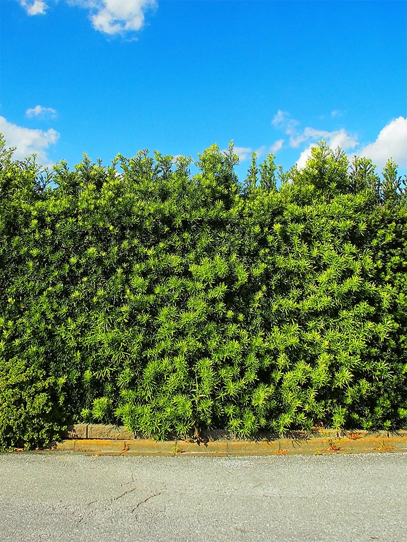 With densely foliated lower limbs which reach the ground and neat, dark green, evergreen leaves, yew podocarpus is very popular as a dense screen or hedge. However, yew podocarpus can reach 20 to 30 feet in height when not sheared and is quite attractive as a tree with the lower branches removed, revealing the light brown, peeling bark. If space permits, leave the lower limbs on the podocarpus for an almost spruce-like appearance. The plant grows in an open manner with large spaces between the branches creating a pleasing, irregular oval silhouette in middle and old age. The inconspicuous flowers are followed by fleshy, purple, small, edible fruits on female trees; we can not guarantee if a plant purchased will be male or female. This is one of a few trees which can be pruned into a nice hedge. The dark green foliage and dense growth creates a formal mass. It looks better when pruned with a hand pruner, not sheared with a hedge trimmer. Showing best growth and form in full sun, yew podocarpus will grow more slowly and have a looser appearance when grown in shade. It will grow on the north side of a tall building with little or no direct sun. It will tolerate a wide variety of well-drained, acidic soils. Do not plant on wet soils. This is a tough plant, adaptable to urban conditions in USDA Zones 8-11.