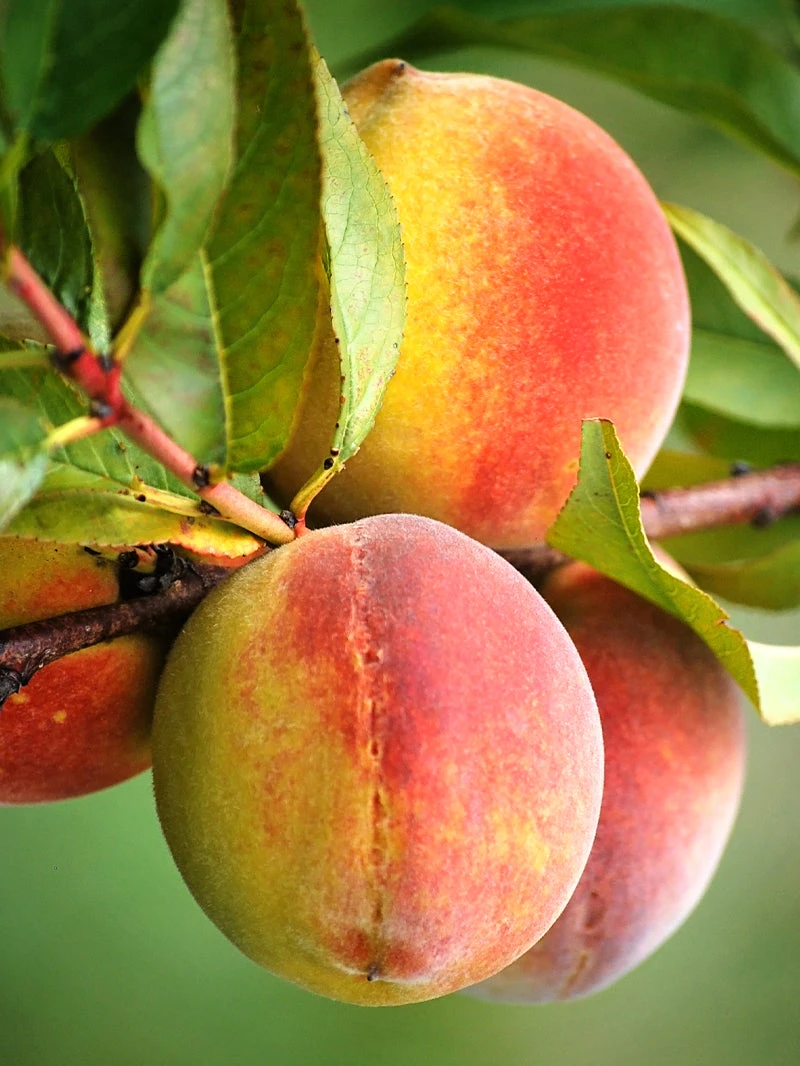 Harvester produces a firm, medium, freestone fruit with 50-70% red with a yellow to orange background. The yellow flesh has an excellent taste and ripens in mid-June, 21 days before Elberta. It requires 750 chill hours and self-fertile. At maturity, it can reach a height between 12-15 feet and a spread between 10-12 feet.