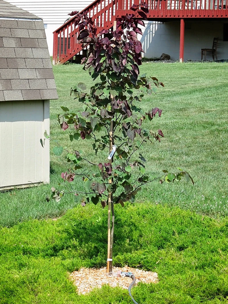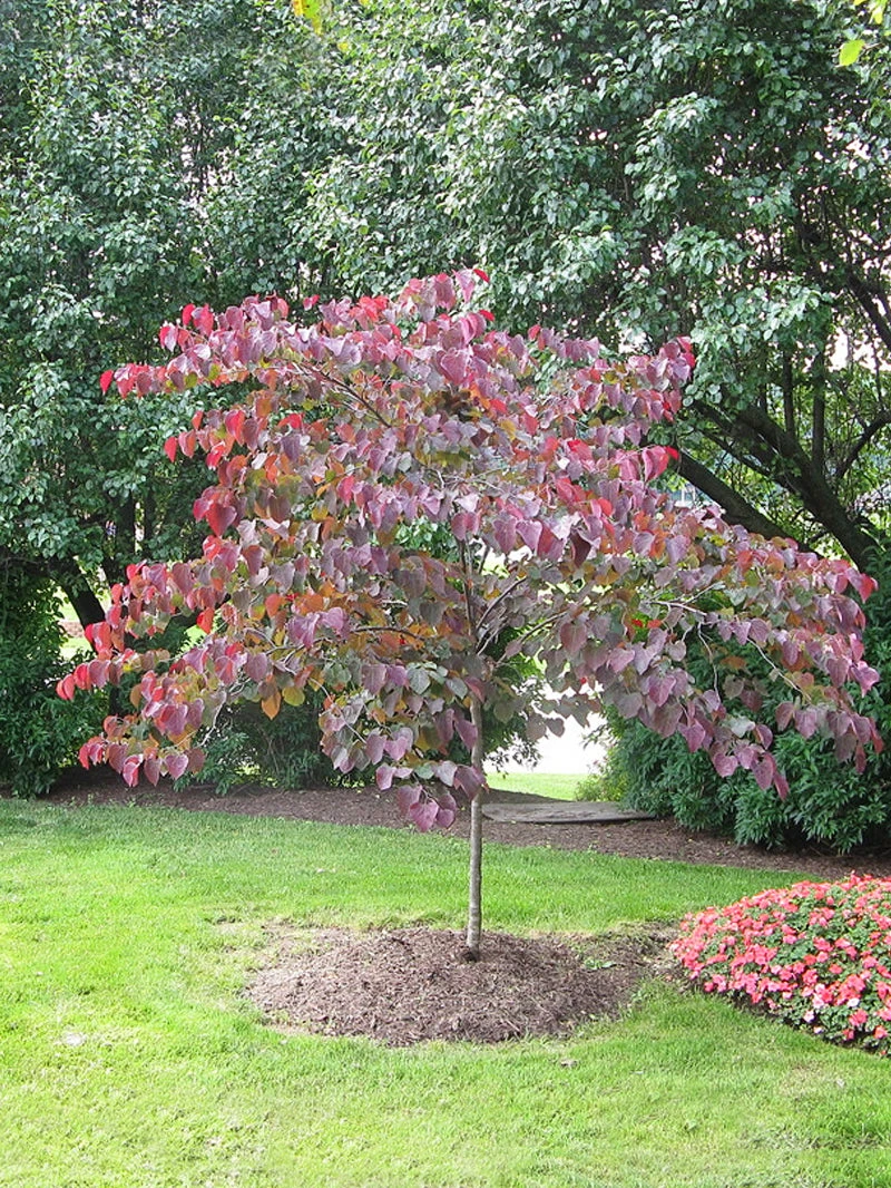 The Forest Pansy Redbud is a small, deciduous tree with large, dark purple, heart-shaped leaves. In the spring, prior to the foliage emerging, the tree produces small, beautiful rose-purple flowers. The tree has a medium to fast growth-rate and grows 20-30 feet tall with a 12-25 foot spread. It is hardy in Zones 6-9.Â